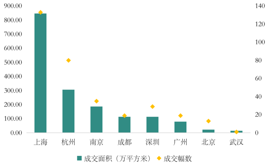 從數(shù)據(jù)可以看出,上海租賃用地?zé)o論是累計(jì)成交面積還是成交幅數(shù)都排全國(guó)首位,并遙遙領(lǐng)先于第二、第三位的杭州和南京。