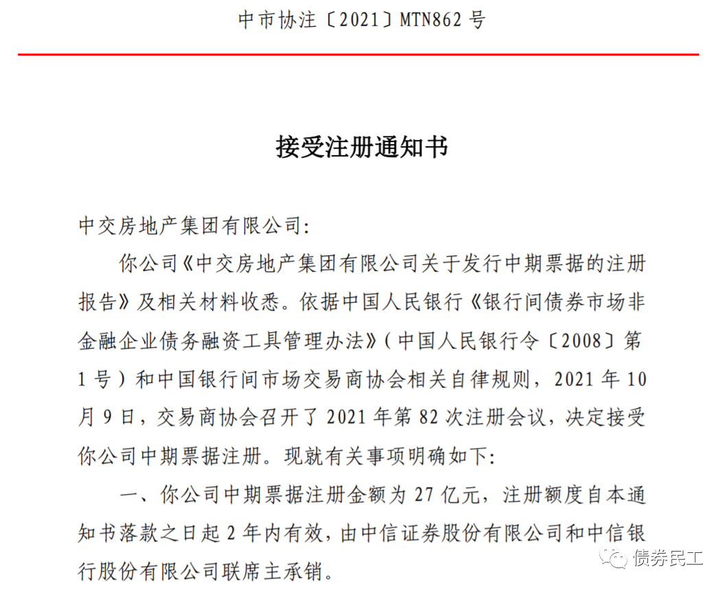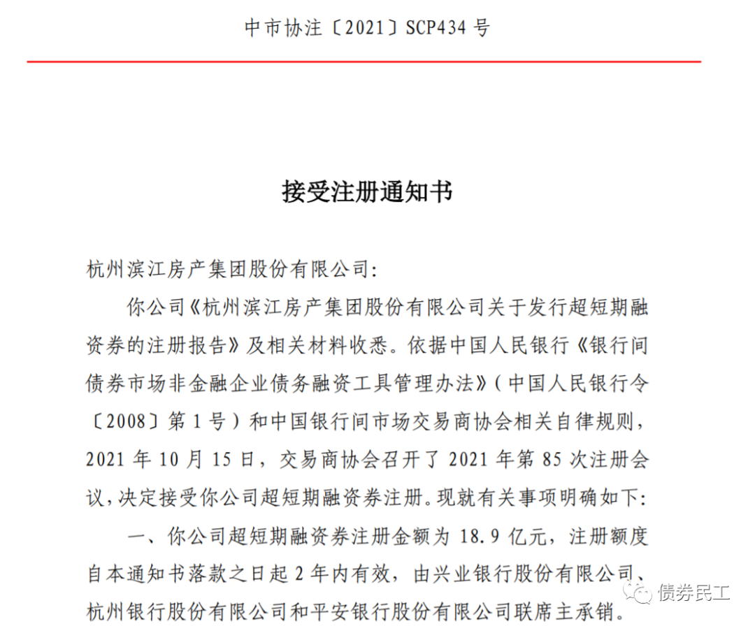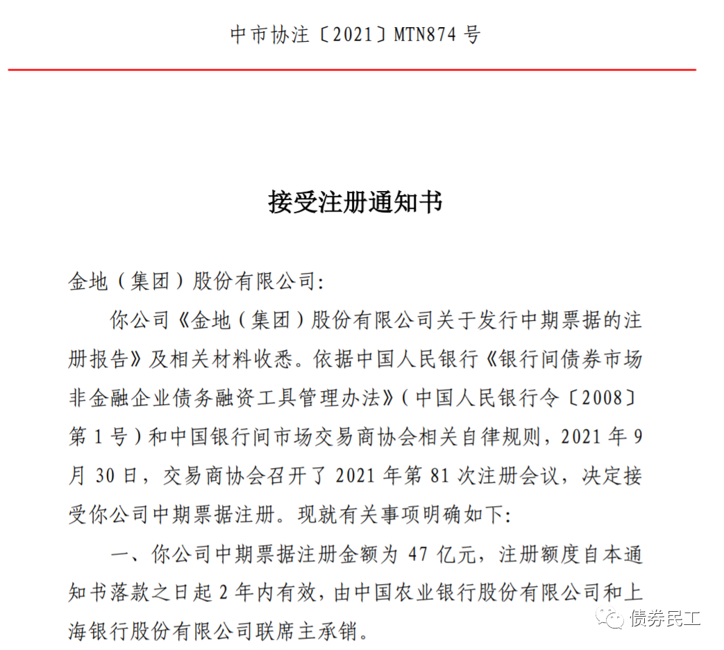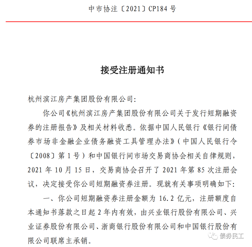 根據中國銀行間市場交易商協會網站的公開信息,交易商協會于2021年11月24日接受金地(集團)股份有限公司、中交房地產集團有限公司和杭州濱江房產集團股份有限公司三家房地產公司總金額合計為135.60億元債務融資工具產品的注冊,具體債務融資工具產品注冊情況如下: