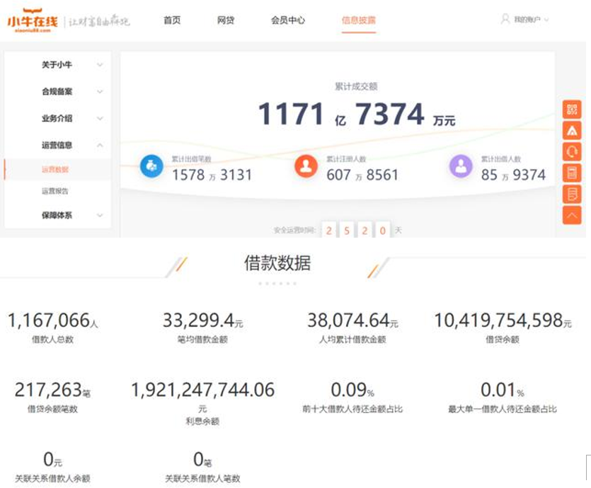 彼時(shí)小牛在線官網(wǎng)實(shí)時(shí)數(shù)據(jù)顯示,平臺(tái)累計(jì)成交額已達(dá)1171.74億元,累計(jì)出借筆數(shù)1578.3萬筆,注冊人數(shù)超608萬,出借人數(shù)85.94萬;借貸余額104.2億元,僅利息余額就多達(dá)19.2億元。