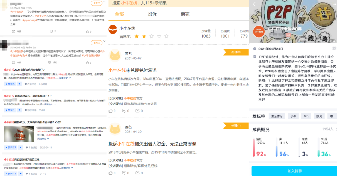 為追討欠款,許多投資者“報(bào)團(tuán)取暖”,創(chuàng)建或加入了小牛在線維權(quán)群。雷達(dá)財(cái)經(jīng)搜索發(fā)現(xiàn),有維權(quán)群中維權(quán)者多達(dá)1954人,其他名為“回款交流群”、“堅(jiān)持到底群”、“難友集中營”的群友也多達(dá)數(shù)百人,但相關(guān)群主并不希望接受采訪,“我們有自己的維權(quán)方式。”