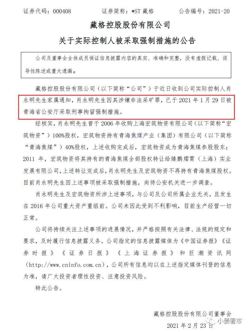 2月22日晚間,*ST藏格(000408.SZ)公告稱,公司實際控制人肖永明因其涉嫌非法采礦罪,已于2021年1月29日被青海省公安廳采取刑事拘留強制措施。