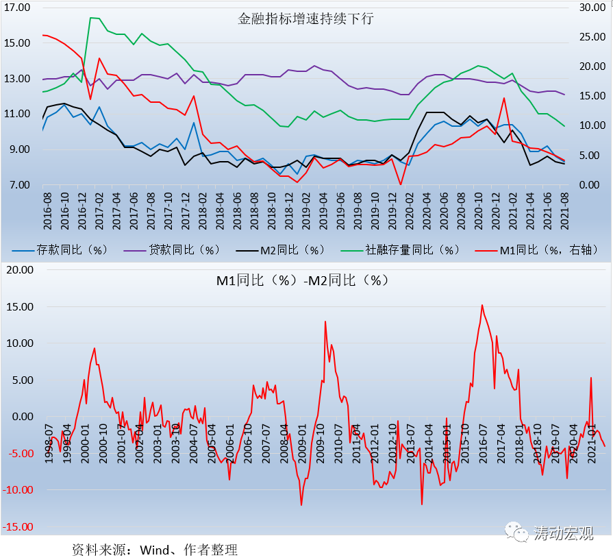 (四)自今年5月以來,M1與M2之間的剪刀差正呈現擴大趨勢,M1同比增速與M2同比增速的剪刀差已由今年5月的-1.90%擴大至8月的4%,這表明企業貸款派生存款的能力以及企業開工意愿實際上在下降,同時也意味著消費信貸需求下降導致居民存款向企業存款轉移的力度在減弱。