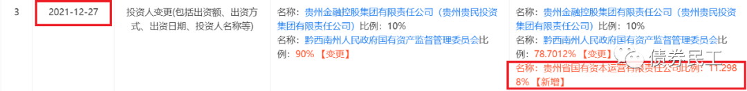 4、2021年12月27日,貴州國資公司成為黔西南州水資源開發投資有限公司(實際控制人黔西南州國資委)持股比例為11.2988%的股東。