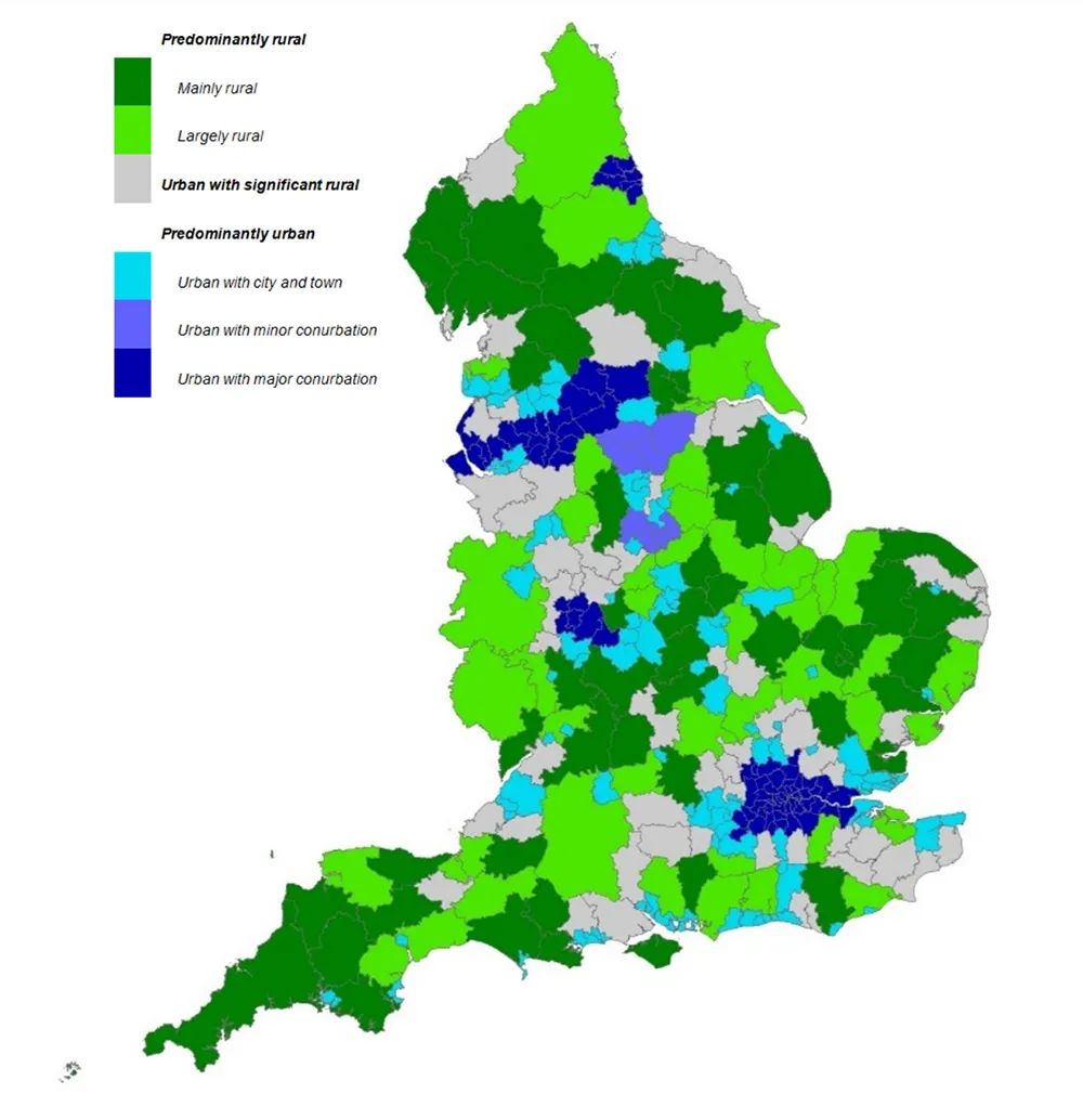 如今,英國的城鄉(xiāng)界定中,「城鄉(xiāng)二元」的界限已十分弱化,英國基于人口密度、居住形態(tài)、鄉(xiāng)村性、城鄉(xiāng)聯(lián)系性、商業(yè)集中度等多重因素,形成了鄉(xiāng)村空間系統(tǒng)的網(wǎng)格架構(gòu)。