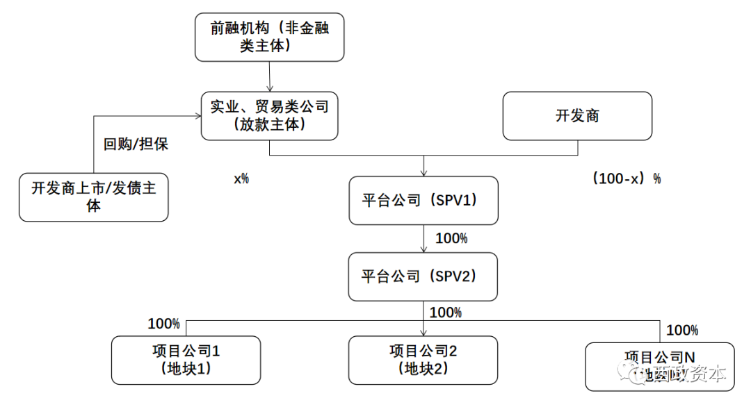 2. 前融機(jī)構(gòu)指定的放款主體與開(kāi)發(fā)商共同按配資比例以股加債形式將資金注入平臺(tái)公司(SPV1),其中平臺(tái)公司(SPV1)注冊(cè)資本設(shè)置為較小金額(如500萬(wàn)元),該放款主體需轉(zhuǎn)入的其他剩余融資款全部以股東借款的形式注入平臺(tái)公司(SPV1),另外開(kāi)發(fā)商持有的平臺(tái)公司(SPV1)的股權(quán)質(zhì)押給放款主體,同時(shí)開(kāi)發(fā)商的上市主體或發(fā)債主體就平臺(tái)公司(SPV1)向該放款主體的借入的款項(xiàng)提供擔(dān)保(但一般無(wú)需提供土地抵押)。