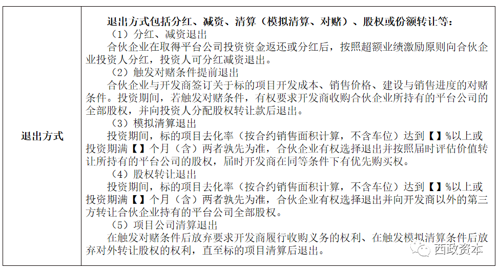 7. 退出方式:分紅、減資退出;觸發(fā)模擬清算退出;轉(zhuǎn)讓平臺(tái)公司股權(quán)退出;觸發(fā)對(duì)賭條件退出;項(xiàng)目公司實(shí)際清算退出。