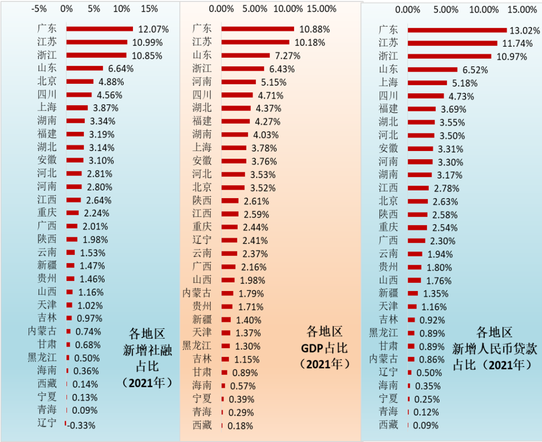 具體看,2021年廣東與浙江的GDP份額分別為10.88%與6.43%(合計(jì)占比17.31%),但其獲得的社融支持份額卻分別達(dá)到12.07%與10.85%(合計(jì)占比達(dá)到22.92%),獲得的人民幣貸款支持份額亦分別高達(dá)到13.02%和10.97%(合計(jì)占比達(dá)到23.99%)。