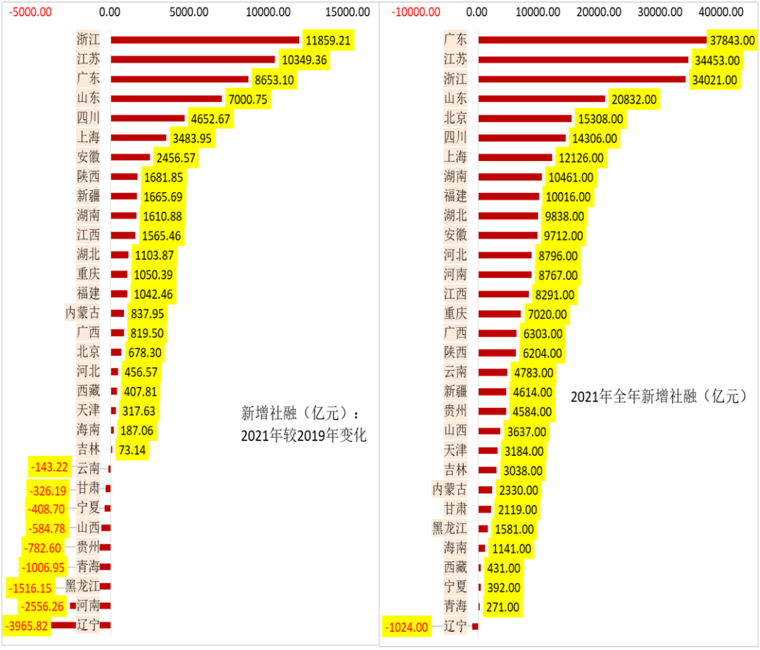 前面已經(jīng)指出,2021年全國新增社融較2019年同期多增了5.78萬億,基于此理論上可以認(rèn)為各地的2021年新增社融較2019年亦會對應(yīng)出現(xiàn)明顯多增,但實(shí)際上我們?nèi)匀豢吹?個地區(qū)的2021年新增社融情況不如2019年。具體看,