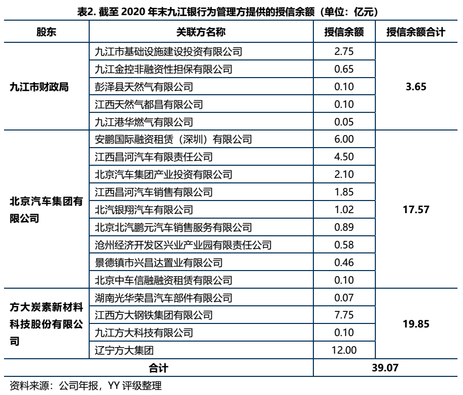 截至2020年末,九江銀行為關聯方共提供了41.06億元的授信額度。其中對方大炭素及其關聯公司的綜合授信額度最高,達到了19.85億元,授信對象之一江西方大鋼鐵集團本身獲得外部授信充足,另一對象遼寧方大集團也有12億余額授信。