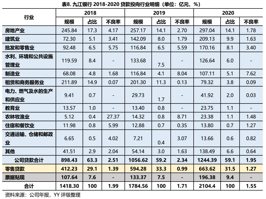 九江銀行通過貸款、公司債券投資以及非標資產投資流向房地產及相關行業的資金規模較大,且九江市房地產的市場不溫不火,可能會是潛在的風險點;2020年疫情對貸款期限延長可能導致未來風險集中暴露。