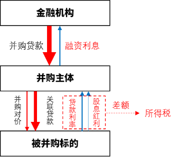 一般的杠桿并購(見圖1),并購貸款是并購主體從金融機構獲取的,所以融資利息發生在并購主體層面(上層),而股息紅利則發生在被并購標的的層面(下層)。在這個情況項下,融資利息和股息紅利發生在兩個不同的層面,不能作為應納稅所得額的“稅盾”,而需要依賴被并購標的本身是否擁有足夠的稅前抵扣項。