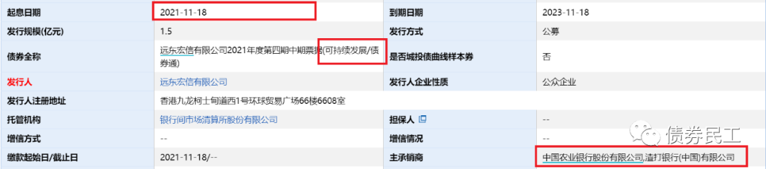 遠東宏信有限公司2021年度第四期中期票據(可持續發展/債券通)于2021年11月18日正式起息,是國內首單可持續發展債券!