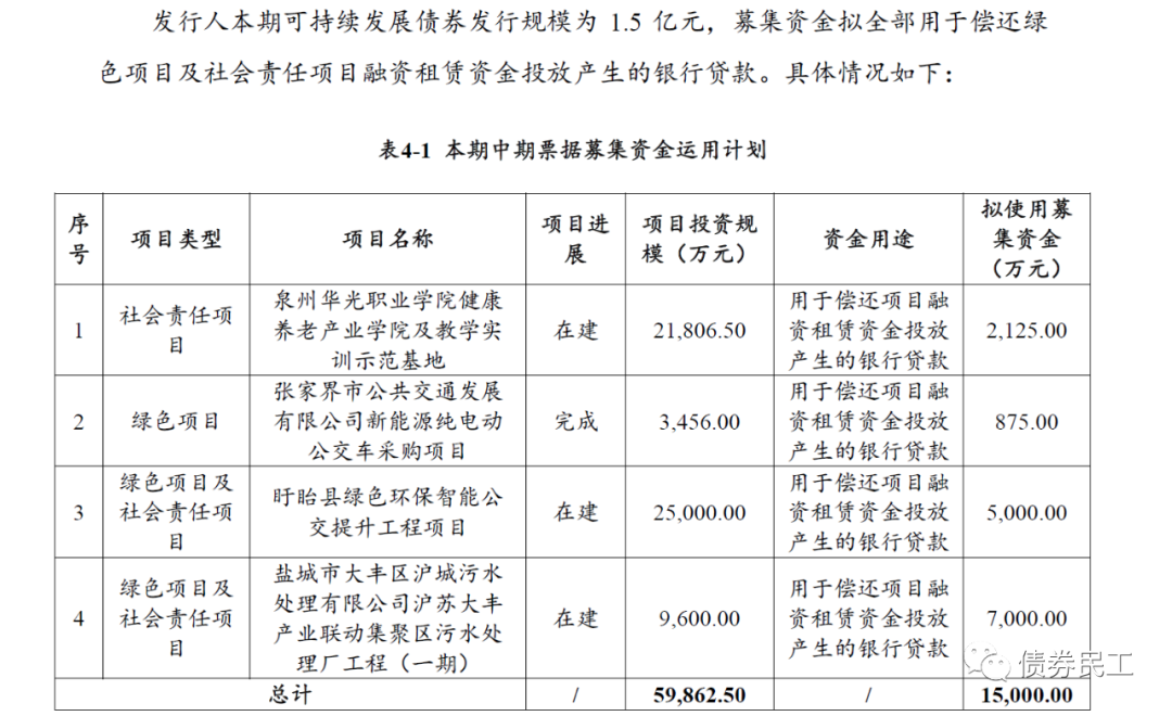 本期債券的發行規模為1.5億元,發行期限為2年。根據公開披露的信息,本次債券的募集資金用途為償還綠色項目及社會責任項目融資租賃資金投放產生的銀行貸款,共涉及到4個項目,分別屬于社會責任項目和綠色項目路。與此同時,募集說明書同時披露了4個募投項目的經濟效益、社會效益和環境效益。