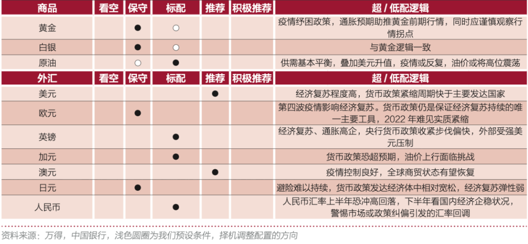 在年度策略層面,2021年初,中行認為全球大類資產配置順序為商品、權益、黃金、債券。3月份,中行將全球大類資產配置順序中的債券和黃金順序對調,調整為:商品、權益、債券、黃金。