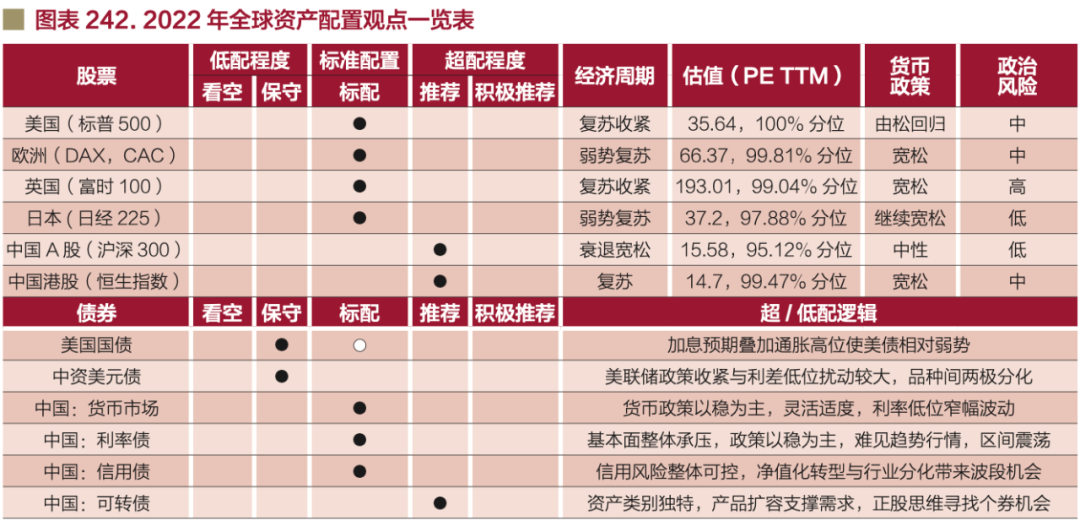 基于上述研判,中行認為,在“百年變局,加速演進”宏觀主題下,全球財富加速再平衡,中國份額繼續提升。2022年全球大類資產配置順序為:權益、債券、黃金、商品。立足中國,超配中國A股和中國港股。