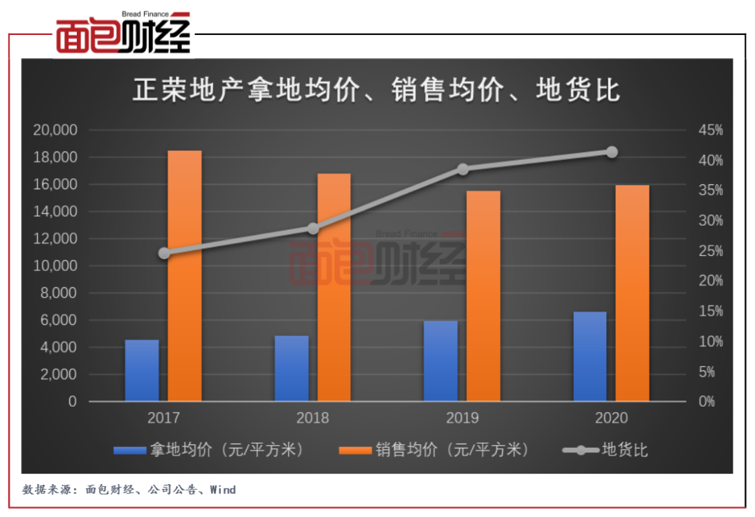 查閱相關(guān)數(shù)據(jù),近幾年來,正榮地產(chǎn)的拿地均價(jià)逐步走高,但銷售均價(jià)相對降低,致使地貨比(權(quán)益拿地均價(jià)/銷售均價(jià),下同)持續(xù)提升。2017年至2020年,公司拿地均價(jià)分別為4557元/平方米、4829元/平方米、5968元/平方米、6616元/平方米;銷售均價(jià)分別為18484元/平方米、16765元/平方米、15488元/平方米、15949元/平方米;地貨比分別為24.65%、28.80%、38.53%、41.48%。