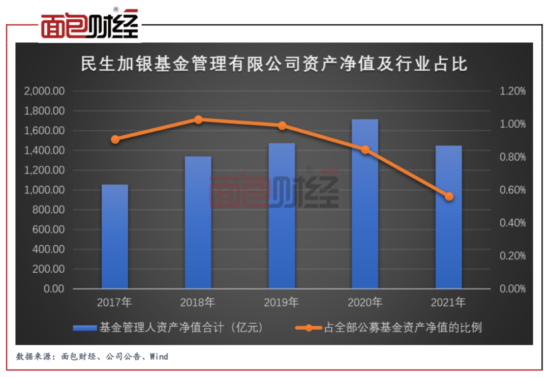 查閱近五年的資產(chǎn)凈值發(fā)現(xiàn),民生加銀基金2017年至2020年的資產(chǎn)凈值整體處于上升趨勢,但2021年出現(xiàn)明顯下降。對比來看,公募基金行業(yè)的整體規(guī)模則從2020年約20萬億元大幅上升至2021年突破25萬億元。一漲一跌共同作用下,民生加銀基金的行業(yè)資產(chǎn)凈值占比在2021年出現(xiàn)大比例下滑。