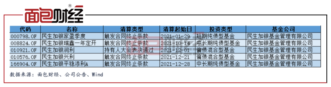 數(shù)據(jù)顯示,按照清算起始日測算,民生加銀基金2021年共有5只基金清算(初始基金口徑),其中4只因?yàn)橛|發(fā)合同終止條款,1只因?yàn)槌钟腥舜髸?huì)表決通過。