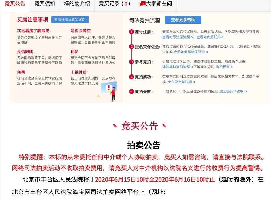 競(jìng)買(mǎi)公告:這里主要介紹注意法院是否會(huì)負(fù)責(zé)騰空、有無(wú)租賃、土地性質(zhì)的問(wèn)題;還有競(jìng)拍流程可以參與“模擬競(jìng)拍”來(lái)先嘗試;