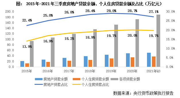 2021年三季度末,全國房地產貸款余額51.4萬億元,占各項貸款余額的比重進一步回落至27.1%,較2020年末再降1.6個百分點。其中,個人住房貸款余額37.4萬億元,占各項貸款余額的比重跌至19.7%,較2020年末減少0.3個百分點。
