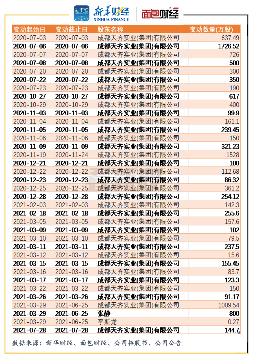 數(shù)據(jù)顯示,2020年7月至12月,天齊集團(tuán)通過集合競價(jià)和大宗交易,合計(jì)減持約8861萬股公司股份,合計(jì)減持金額超16億元;2021年1月,天齊集團(tuán)及其一致行動人張靜、李斯龍發(fā)布減持計(jì)劃,至當(dāng)年7月29日減持計(jì)劃實(shí)施完成,上述三位股東合計(jì)減持約3548萬股公司股份,合計(jì)套現(xiàn)超18億元。
