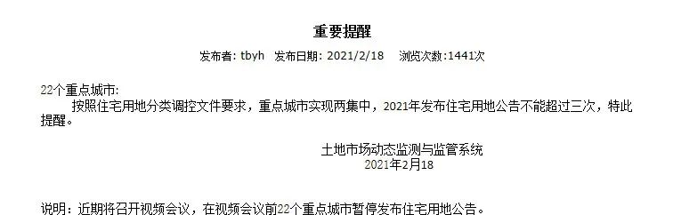 作為配套的監(jiān)管政策,上述22個(gè)城市,將會(huì)受到住建部的單獨(dú)照顧,會(huì)統(tǒng)一安排發(fā)布土地出讓公告,統(tǒng)一組織土儲(chǔ)出讓,而且還額外據(jù)傳2021年的住宅集中出讓公告,不得超過(guò)3次,這個(gè)才是重點(diǎn)的重點(diǎn)。如下圖: