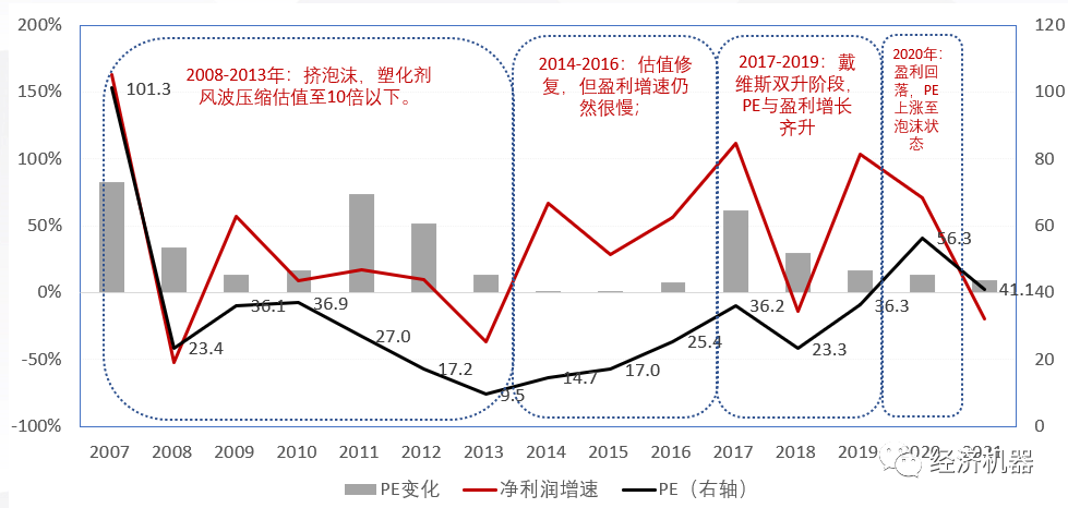 3)2017-2019年:提價成功,盈利兌現,帶動了戴維斯雙升。期間,股價上漲270%,但由于盈利高增長,PE估值從25倍上升到36倍;