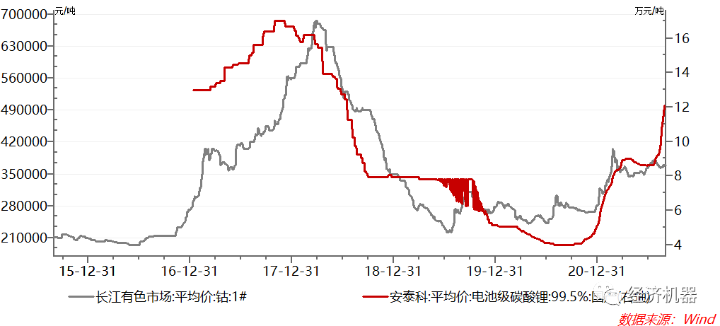 當然,我們也對當前的有“鋰”走邊天下的新能源瘋狂行情提示一下,鋰鈷等小金屬本質上仍然具有強周期屬性。2018年相關金屬曾經暴跌過,比如鈷一度從69萬/噸跌至22萬/噸,跌幅高達70%;電池級碳酸鋰從16.4萬/噸,跌至4萬/噸,跌幅高達75%,至今均為恢復至前期高點(圖7)。相關股票在2018年調整期間,跌幅高達70%。所以,現在“鋰”的各種短缺被炒上天,但一旦供需格局轉變,或者情緒變化,可能會引發慘烈調整。所以,在趨勢的后半段,建議縮短投資時限,出現離場信號就不要猶豫,尤其不要頭腦發熱或堅持做“時間的朋友”,這個跌起來比核心資產要猛烈的多。