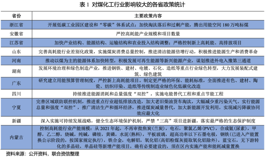 為實現碳中和目標,各省已出臺了相應政策。通過政策梳理發現部分省份政策對煤化工未來發展制約性較大;主要表現在(1)嚴格控制高能耗、高排放“雙高”項目的審批;(2)淘汰落后產能和過剩產能,實現燃煤指標釋放;(3)加快超低排放改進;加快能源結構調整,如煤化工企業的電力、蒸汽等二次能源的源頭結構等;(4)采用碳排放交易增加企業環境保護動力。