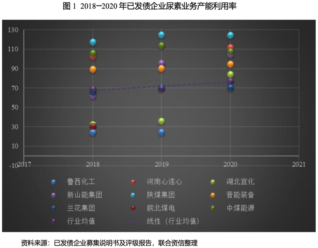 通過下圖已發債尿素企業的產能利用率分布可以看出,2018年,魯西化工、湖北宜化、新山能集團、山西蘭花煤炭實業集團有限公司(以下簡稱“蘭花集團”)和安徽省皖北煤電集團有限責任公司(以下簡稱“皖北煤電”)尿素產能利用率均低于行業均值。皖北煤電的子公司安徽淮化集團有限公司已于2018年停產整頓,后期不再生產尿素。