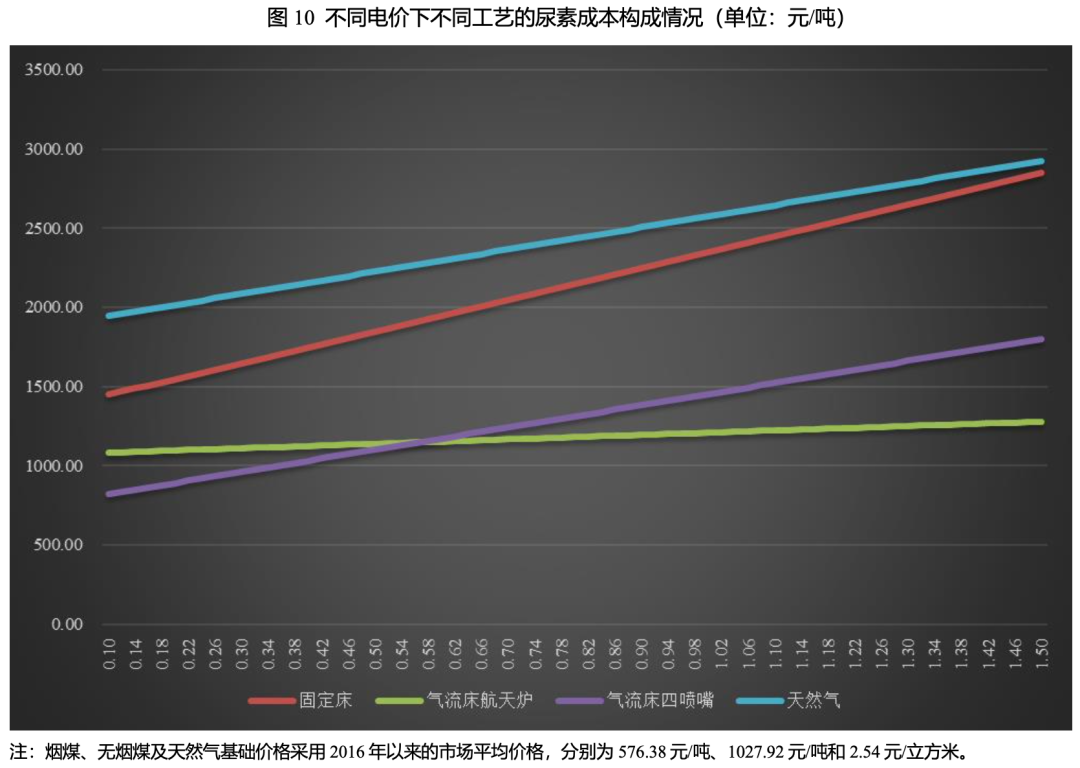 假設其他期間費用以及原材料價格不變,其中煙煤、無煙煤及天然氣基礎價格采用2016年以來的市場平均價格,分別為576.38元/噸、1027.92元/噸和2.54元/立方米,在電價起始價格0.1元/度(現在市場上風電發電的最低成本)分別上漲1倍、4倍和8倍的情況下,不同工藝下尿素的生產成本上漲幅度如下表所示。同時,通過不同電價測算出不同工藝的成本構成如下圖所示。通過數據測算可以看出氣流床四噴嘴爐裝置對電價的敏感性最高,氣流床航天爐裝置對電價的敏感性最低。天然氣工藝和固定床工藝在不同電價下生產成本始終高于氣流床工藝。當電價小于0.57元/度的情況下,氣流床四噴嘴爐裝置的生產成本更低;當電價高于0.57元/度,氣流床航天爐裝置的生產成本更低。