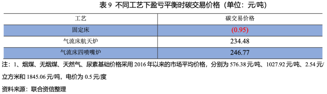 通過上文測算發現原材料價格變動對尿素的生產成本影響很大,因此不同原材料價格下碳交易后能否實現盈利至關重要。下圖選取2016年以來不同原料的歷史數據以及尿素價格的歷史數據,通過尿素碳交易后單噸利潤公式(碳交易后單噸利潤=尿素價格–尿素成本–碳交易成本)測算可以看出氣頭尿素利潤<煤頭固定床裝置利潤<煤頭氣流床裝置利潤,雖然煤頭尿素的碳排放量遠高于氣頭尿素,但煤頭尿素企業的單噸利潤仍高3于氣頭尿素,主要系我國天然氣資源緊張,氣頭尿素的原料成本較高所致。同時,煤頭氣流床工藝基本均實現了盈利,氣流床航天爐裝置和氣流床四噴嘴爐裝置的單噸利潤差距不大,天然氣及固定床工藝產生虧損的可能性很大。因此,煤頭氣流床工藝在碳交易后優勢顯著,其中氣流床航天爐裝置和氣流床四噴嘴爐裝置的優勢相當。整體看,雖然煤頭尿素的碳排放量遠高于氣頭尿素,但碳交易后煤頭尿素企業的單噸利潤仍高于氣頭尿素,采用煤頭氣流床工藝的企業更具優勢。在當前碳交易價格下,煤頭氣流床尿素單噸利潤仍較好,尿素企業的減碳動力不足。
