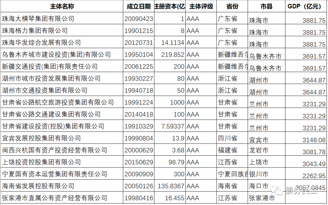 5、AAA城投公司所在區(qū)域的GDP情況。扣除掉直轄市和副省級(jí)城市,蘇州市是全國(guó)AAA城投公司GDP數(shù)據(jù)最高的地級(jí)市;吉林市是AAA城投公司GDP數(shù)據(jù)最低的地級(jí)市。目前共有16家城投公司所在區(qū)域的GDP低于4000億元。