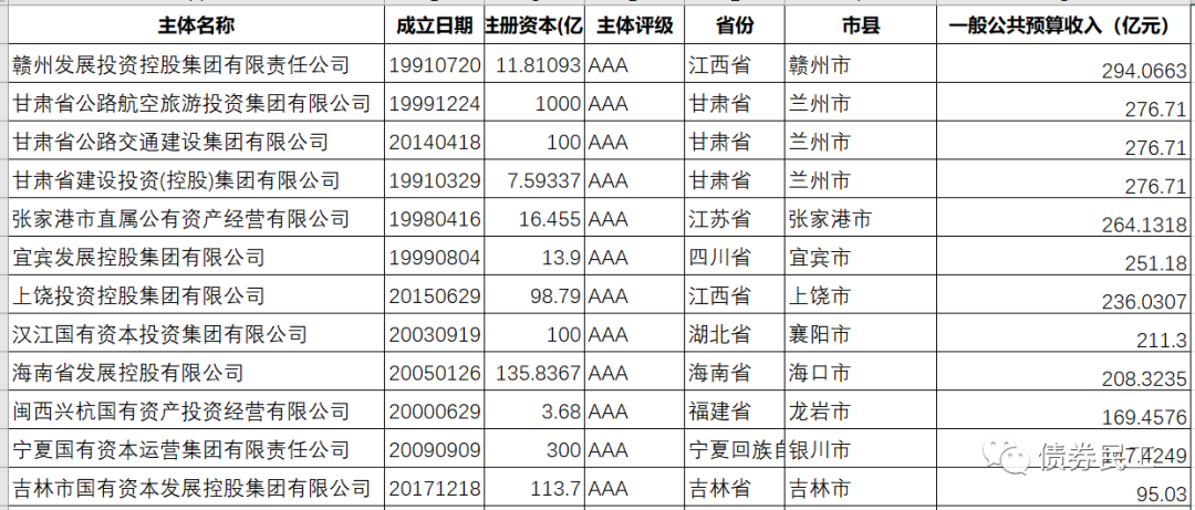 6、AAA城投公司所在區(qū)域的的一般預(yù)算收入情況。扣除掉直轄市和副省級(jí)城市,蘇州市是AAA城投公司一般預(yù)算收入數(shù)據(jù)最高的地級(jí)市;吉林市是AAA城投公司一般預(yù)算收入數(shù)據(jù)最低的地級(jí)市。目前共有12家城投公司所在區(qū)域的一般預(yù)算收入低于300億元。