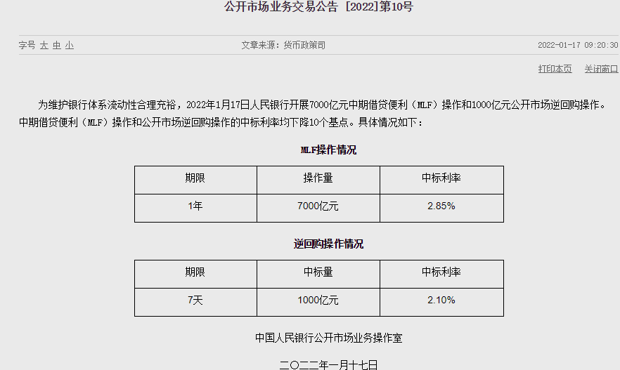 2022年1月17日,央行7000億元1年期MLF(中期借貸便利)操作,利率2.85%,此前為2.95%;同日進(jìn)行1000億元7天期逆回購操作,中標(biāo)利率2.1%,從原來的2.2%下調(diào)10個(gè)基點(diǎn)。