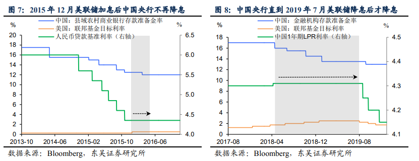 簡單說,2015年12月美聯(lián)儲(chǔ)加息后,我國央行不再降息;然后,我國央行直到2019年7月美聯(lián)儲(chǔ)降息后,才跟著降息。