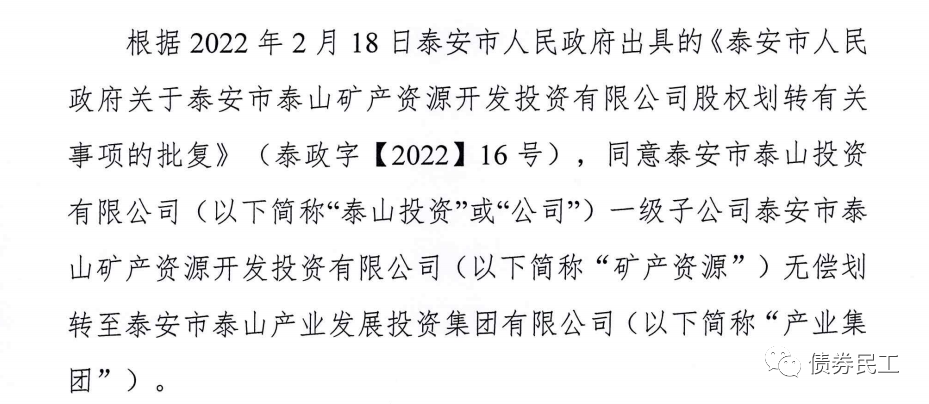 1、根據(jù)泰安市泰山投資有限公司(主體信用等級(jí)AA+)2022年2月21日的公告,將子公司泰安市泰山礦產(chǎn)資源開發(fā)投資有限公司無(wú)償劃轉(zhuǎn)至泰安市泰山產(chǎn)業(yè)發(fā)展投資集團(tuán)有限公司。泰安市泰山產(chǎn)業(yè)發(fā)展投資集團(tuán)有限公司未發(fā)行過(guò)債券。