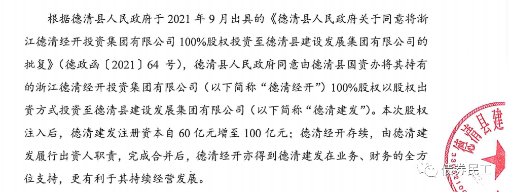 2、根據(jù)德清縣建設(shè)發(fā)展集團(tuán)有限公司(主體信用等級(jí)AA+)2022年2月10日的公告,德清縣國(guó)資辦將其持有的浙江德清經(jīng)開投資集團(tuán)有限公司100%股權(quán)以股權(quán)出資方式投資至公司。浙江德清經(jīng)開投資集團(tuán)有限公司主體信用等級(jí)AA,債券存量金額為12.98億元。