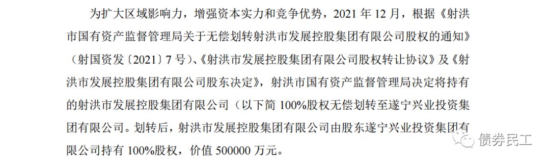 5、根據(jù)射洪市國(guó)有資產(chǎn)經(jīng)營(yíng)管理集團(tuán)有限公司(主體信用等級(jí)AA-)2022年1月28日的公告,射洪市國(guó)有資產(chǎn)監(jiān)督管理局決定將持有的射洪市發(fā)展控股集團(tuán)有限公司100%股權(quán)無(wú)償劃轉(zhuǎn)至遂寧興業(yè)投資集團(tuán)有限公司。遂寧興業(yè)投資集團(tuán)有限公司未發(fā)行過(guò)債券。
