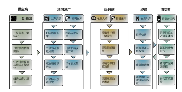 來(lái)源:宿遷國(guó)資公眾號(hào)比如,通過(guò)瓶箱關(guān)聯(lián)體系,在包裝箱和產(chǎn)品上附著二維碼,當(dāng)經(jīng)銷商和終端網(wǎng)點(diǎn)收貨時(shí)均需掃碼。可極大地杜絕制假、造假和區(qū)域竄貨,以及擾亂市場(chǎng)價(jià)格秩序的亂價(jià)問(wèn)題。