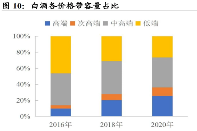 而在本輪行業(yè)復(fù)蘇周期中,除了高端酒拉動(dòng)行情,次高端白酒也表現(xiàn)搶眼。據(jù)東北證券研究顯示,次高端白酒的市場(chǎng)規(guī)模在2016年—2020年的四年間,從250億上升至662億,增長(zhǎng)幅度為165%,超過(guò)高端白酒150%的增幅。市場(chǎng)占有率也從4.13%增長(zhǎng)至10.66%。