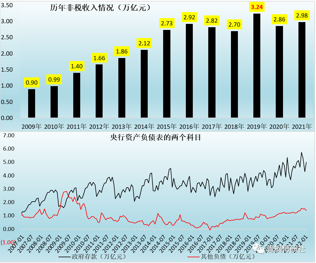 雖然2019年預算報告提出將增加特定國有金融機構和央企上繳利潤,并導致2019年非稅收入同比大幅增加6543億元。但受疫情因素影響,2020-2021年特定國有金融機構和專營機構利潤上繳事宜被暫停。這就意味著2020-2021年兩年期間特定國有金融機構和和專營機構是有結存利潤的,因此2022年預算報告再次提出的該事項,實際上早在2019年便已經做了。