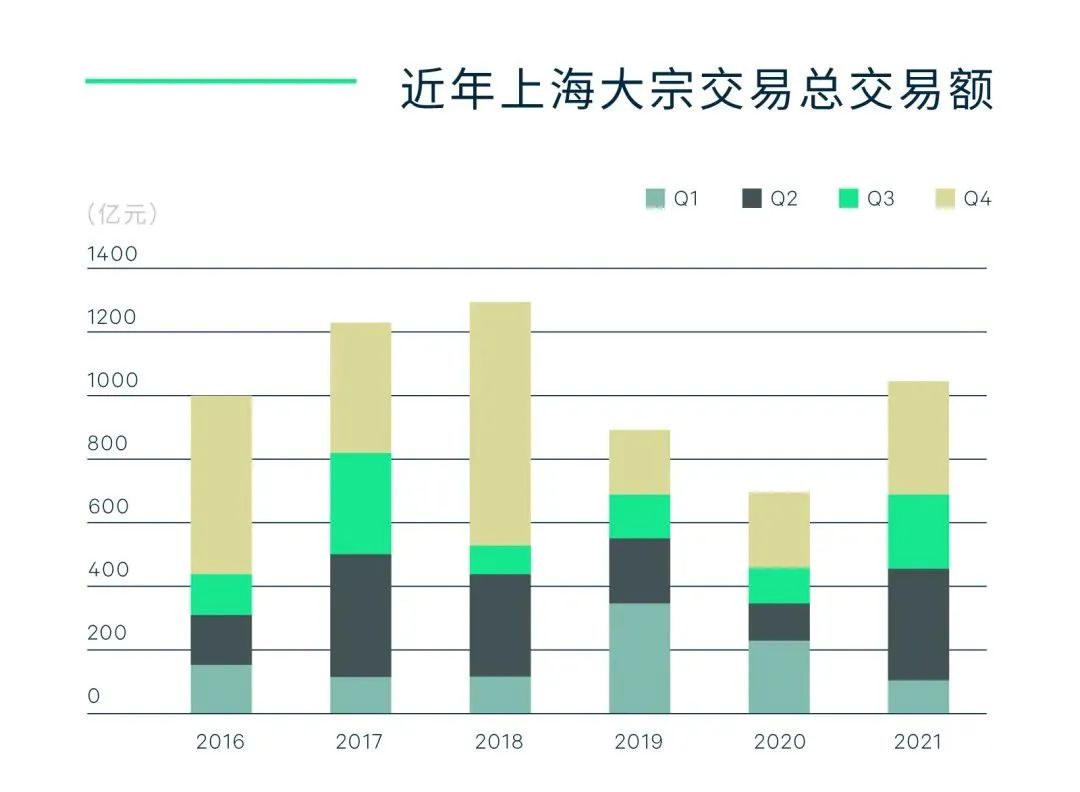 據世邦魏理仕數據顯示,2021年上海大宗交易市場共錄得交易89筆,全年交易總額重返千億量級,達人民幣1,044.3億元,同比上漲51.3%。