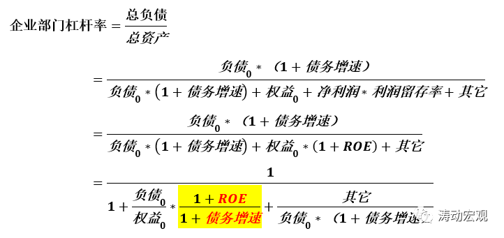 理論上,在企業(yè)沒(méi)有進(jìn)一步補(bǔ)充資本的情況下,只有當(dāng)企業(yè)的債務(wù)增速小于其ROE數(shù)值,才能保證其杠桿率有所下降,當(dāng)然二者之間有一定制約關(guān)系。也即當(dāng)企業(yè)盈利水平提高時(shí),其資產(chǎn)負(fù)債率自然而然會(huì)內(nèi)生性的下降,但是盈利水平的提升往往需要債務(wù)融資給予支持。從下面的推算中可以看出,企業(yè)部門(mén)杠桿率的下降只需要債務(wù)增速不高于ROE數(shù)值即可。