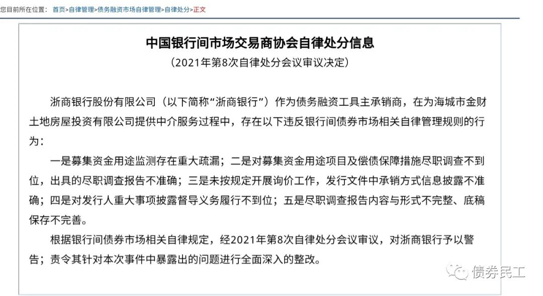 2021年6月18日,交易商協(xié)會同日對郵儲銀行和浙商銀行進行了自律處分,同時被自律處分的還有債券發(fā)行人海城市金財土地房屋投資有限公司(以下簡稱“海城金財”)。