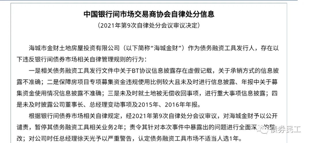 3、交易商協(xié)會對海城金財?shù)淖月商幏衷蛑饕荁T協(xié)議信息披露存在虛假記載、募集資金違規(guī)使用且未及時進行信息披露、未及時披露土地被無償收回事項、未及時披露董事長和總經(jīng)理變動及2015年和2016年年報。交易商協(xié)會對海城金財予以公開譴責(zé)、暫停債務(wù)融資工具業(yè)務(wù)2年;責(zé)令進行深入整改并對高管進行了自律處分。海城金財發(fā)行過多只企業(yè)債券、PPN和公司債券,目前存續(xù)債券“20海財01”,為私募債券產(chǎn)品,存續(xù)債券金額5億元。