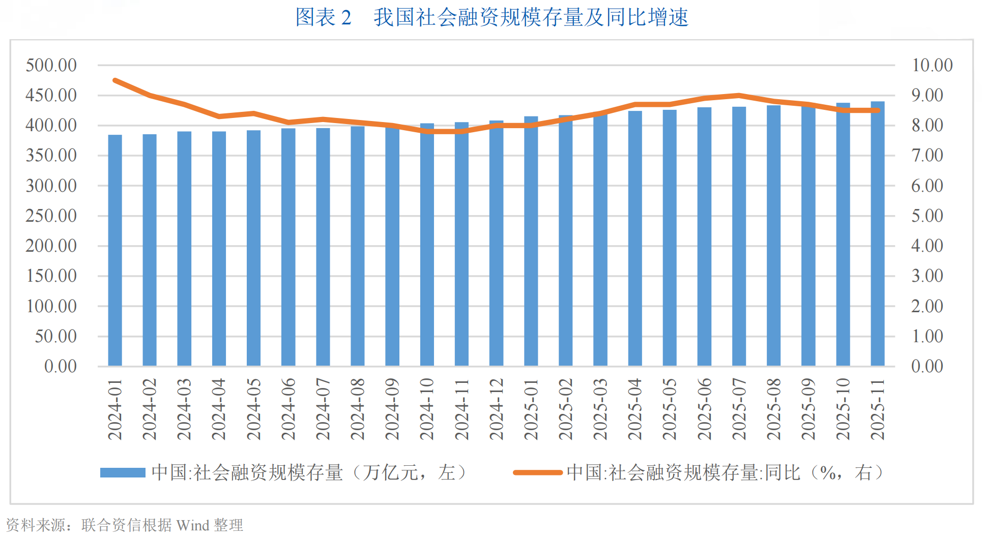 2025年前三季度,我國M2增速呈波動增長態勢,其在7月達到年內高點8.80%后,持續回落至2025年11月末的8.00%。全國社融同比增速維持相同的波動態勢,增速自7月后持續回落,11月末增速為8.50%。社會融資成本方面,2025年5月,5年期LPR下調10bp至3.50%;央行數據顯示,9月,企業新發放貸款加權平均利率約3.1%,較上年同期低40bp,個人住房新發放貸款利率3.1%,較上年同期低20bp,融資成本處于低位。
