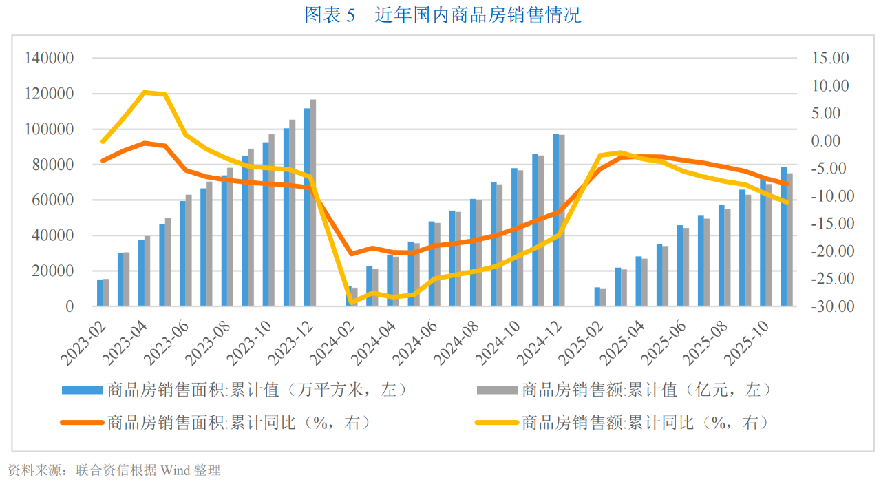 2025年以來,房地產開發經營行業銷售端持續低迷,拖累全國固定資產投資增速轉負,庫存去化周期仍處于高位。房價繼續下降,其中一線城市房價在下半年迎來加速下降。雖外部融資環境維持寬松,但房企融資改善效果有限,在此背景下,房企投資積極性不足,開發投資額繼續收縮。