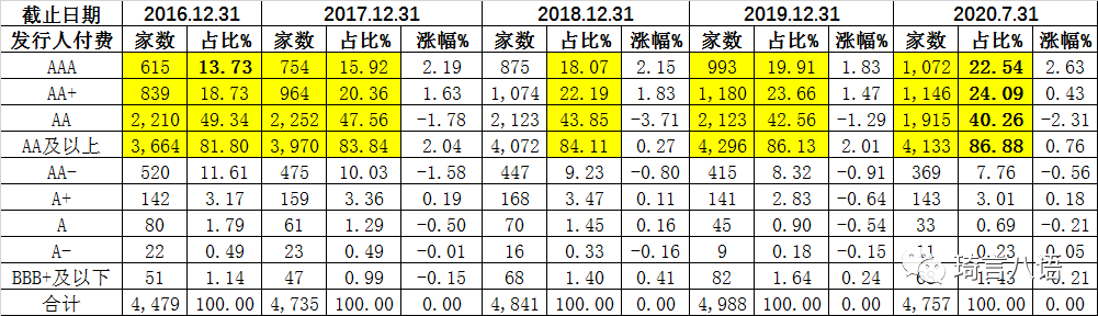但在信用等級符號及定義未變的情況下,發債主體的信用等級卻不斷走高,AA及以上占比從2016年12月31日的81.80%升至2020年7月31日的86.88%,其中AAA評級占比提升幅度最為明顯,從13.73%升至22.54%。按此趨勢,明年市場上AAA評級占比將趕超AA+。