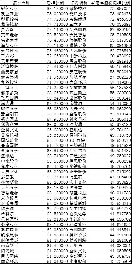 下表分別是質押比例、限售股質押比例前50的公司。